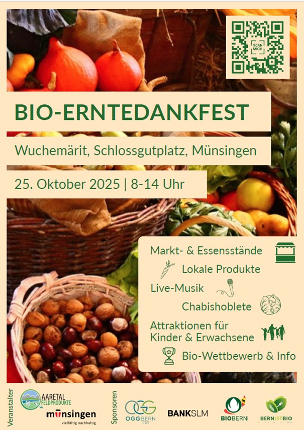 Am Samstag, 25. Oktober, von 8 bis 14 Uhr wird der Schlossgutplatz in Münsingen zum Treffpunkt für Gross und Klein. Zusätzlich zu den regulären Standbetreibenden des Wuchemärit bieten Bio Bern und «Bern ist Bio» in Zusammenarbeit mit dem Verein Aaretal Feldprodukte ein vielfältiges Bio-Verpflegungsangebot und feine Bio-Produkte an.